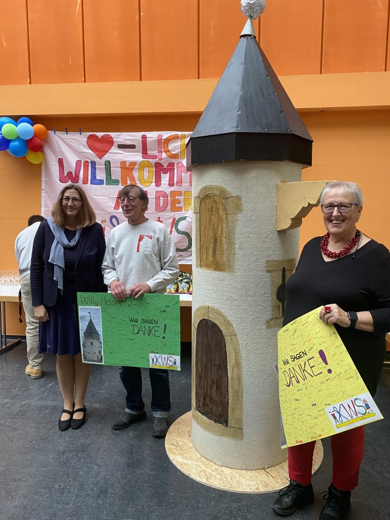 Am Dienstag, den 28. Oktober, wurde das Türmchen feierlich übergeben – bei einer schönen Empfangsfeier mit Schulleiterin Anja Blum, vielen Mitgliedern des Theater-am-Türmchens, Lehrkräften und Ganztagskindern der KWS und weiteren Gästen. Auch die ehemaligen Schulleiter, Peter Bisson und Norbert Stuck, waren anwesend. In fröhlicher Atmosphäre wurde das Türmchen offiziell in Empfang genommen, begleitet von einem eigens zu dem Anlass gedichtetem Lied, vielen staunenden Blicken und einem Sektempfang im Anschluss in gemütlicher Runde mit vielen spannenden Gesprächen.